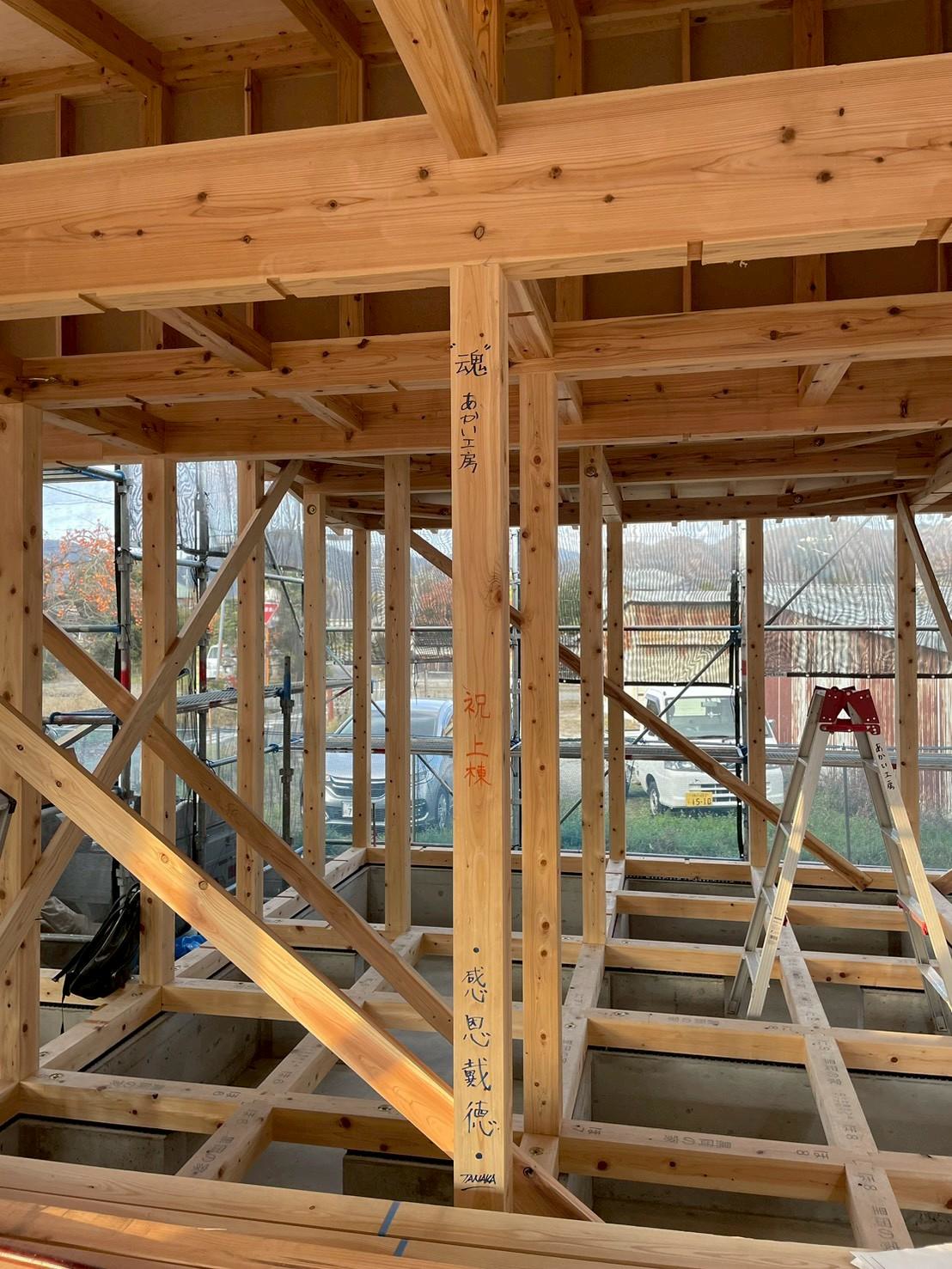 黒岡の家は無事上棟を迎え、施主様にも足場に上がっていただき、