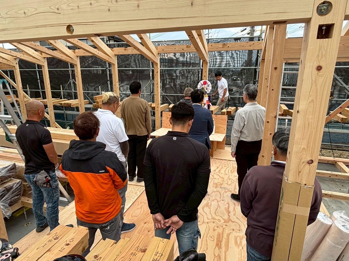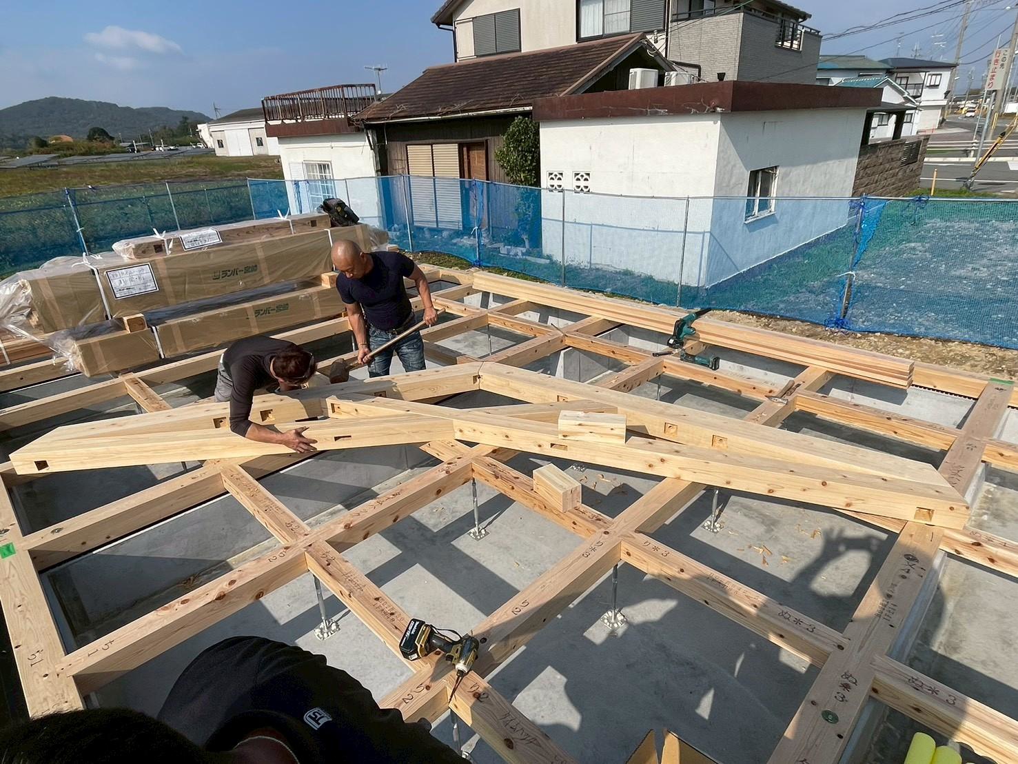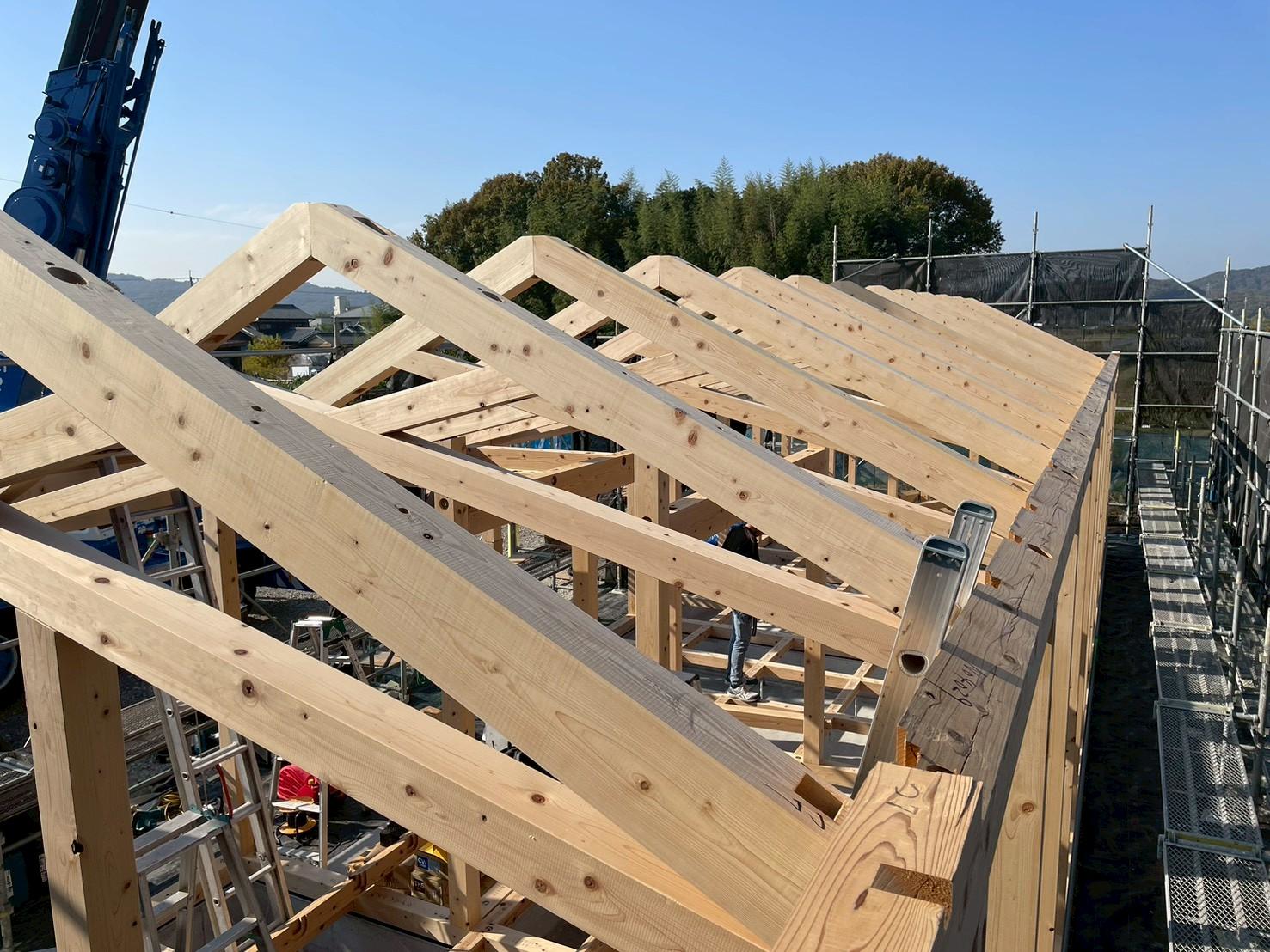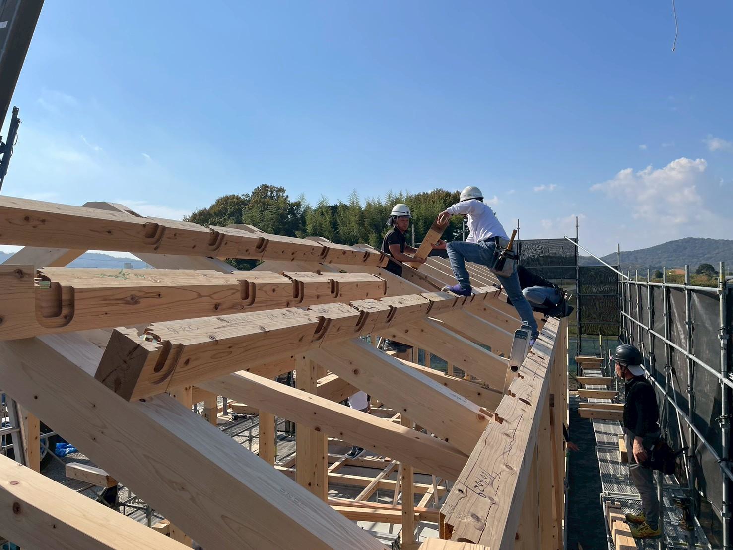 小屋トラスの先組みでは、大工さんたちが声を掛け合いながら13箇所を丁寧に組み上げていきます。