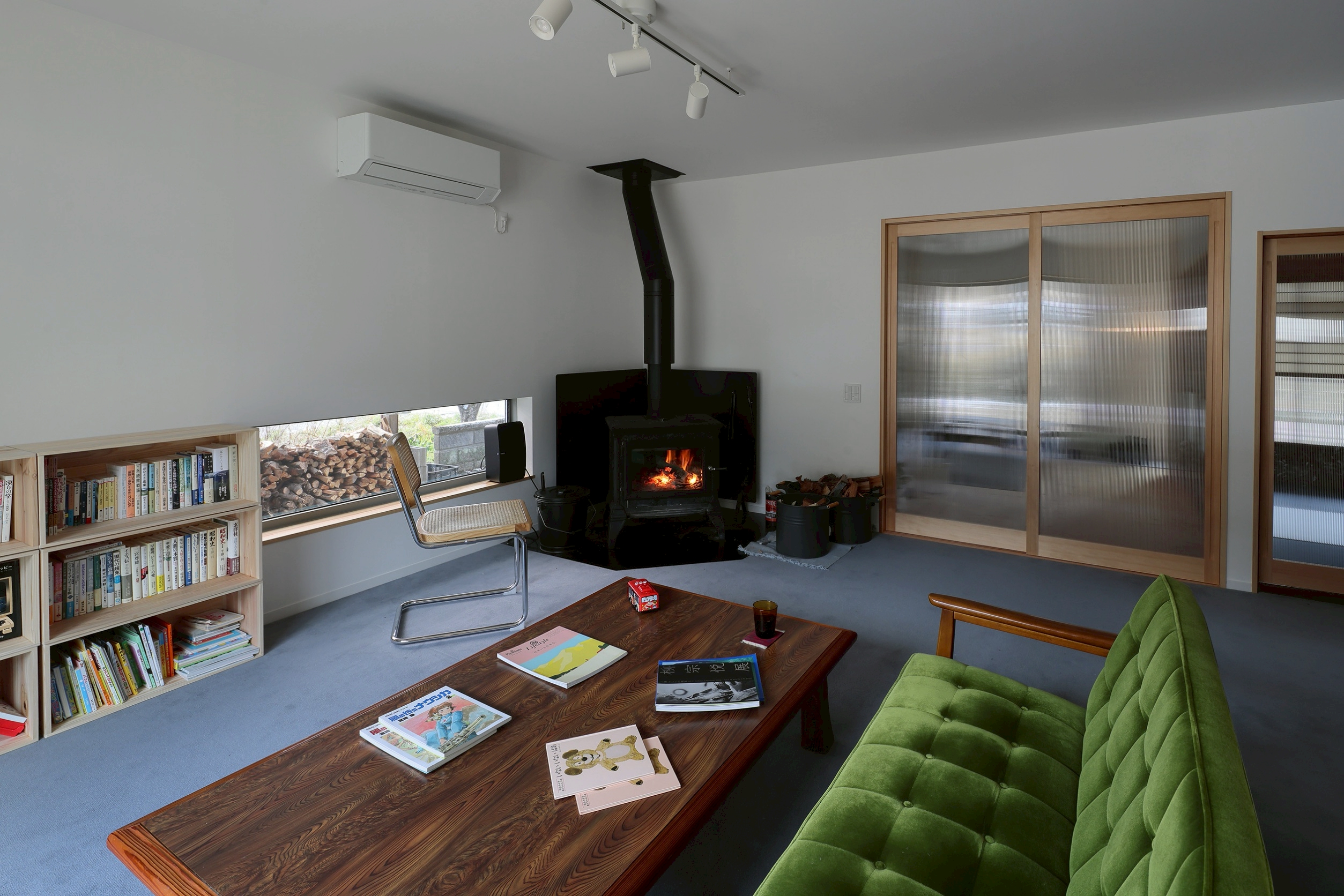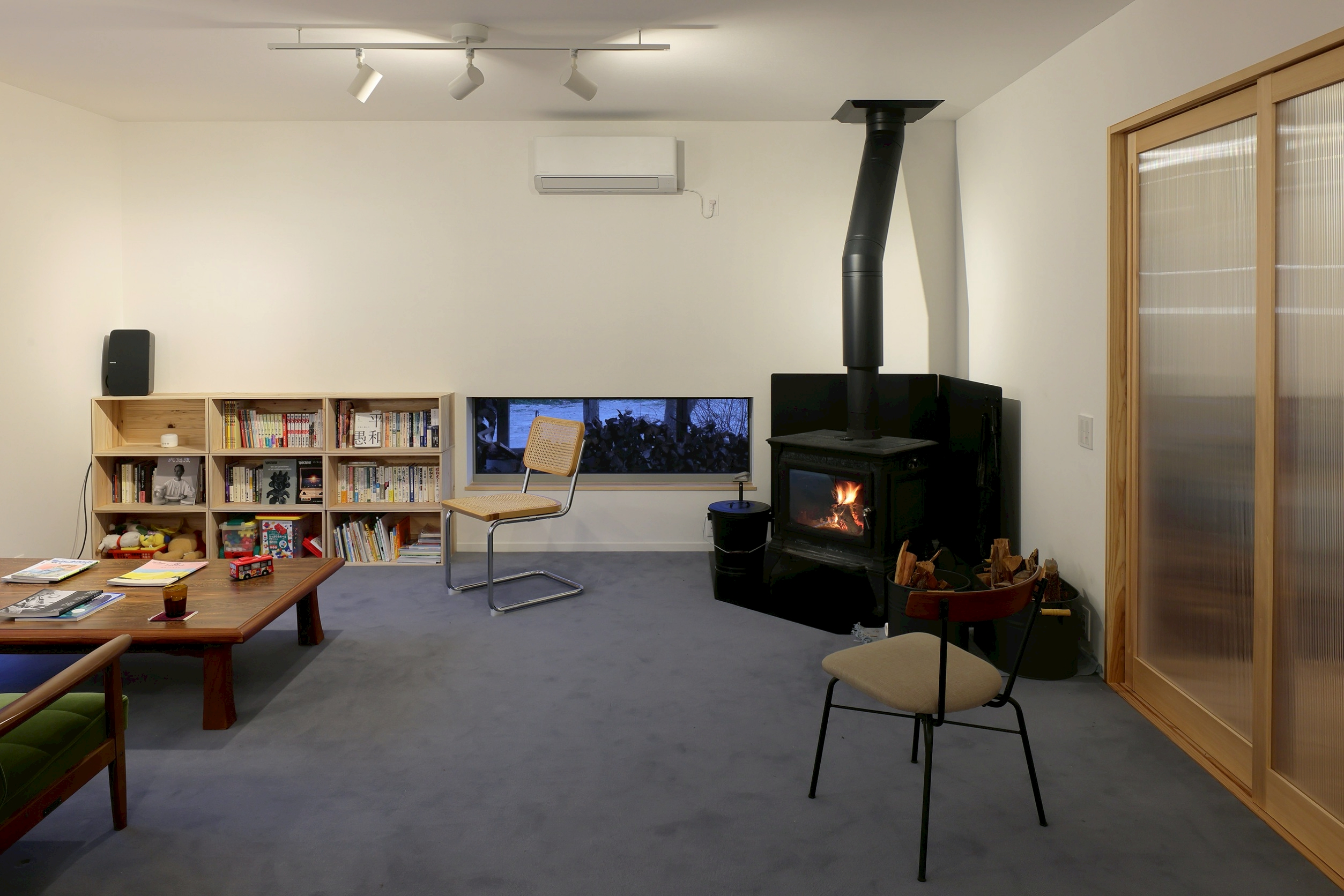 納得いくウールを待ってから施工し、その上に据えたヘリテイジのストーブと静かに調和する。