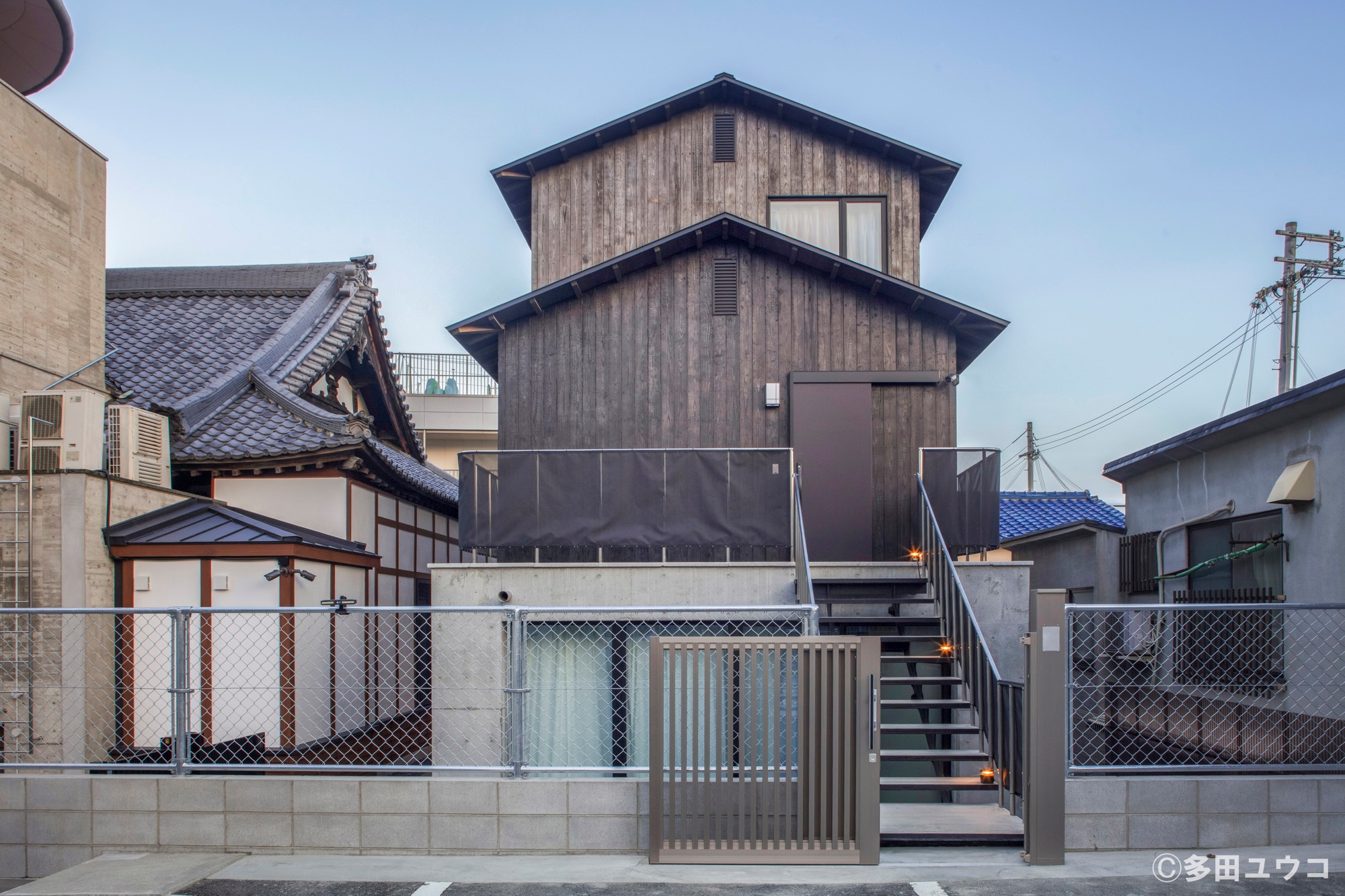 外壁には準耐火仕様の焼板「火ばり」を採用し、境内の空気になじむ落ち着きと温かみを表現