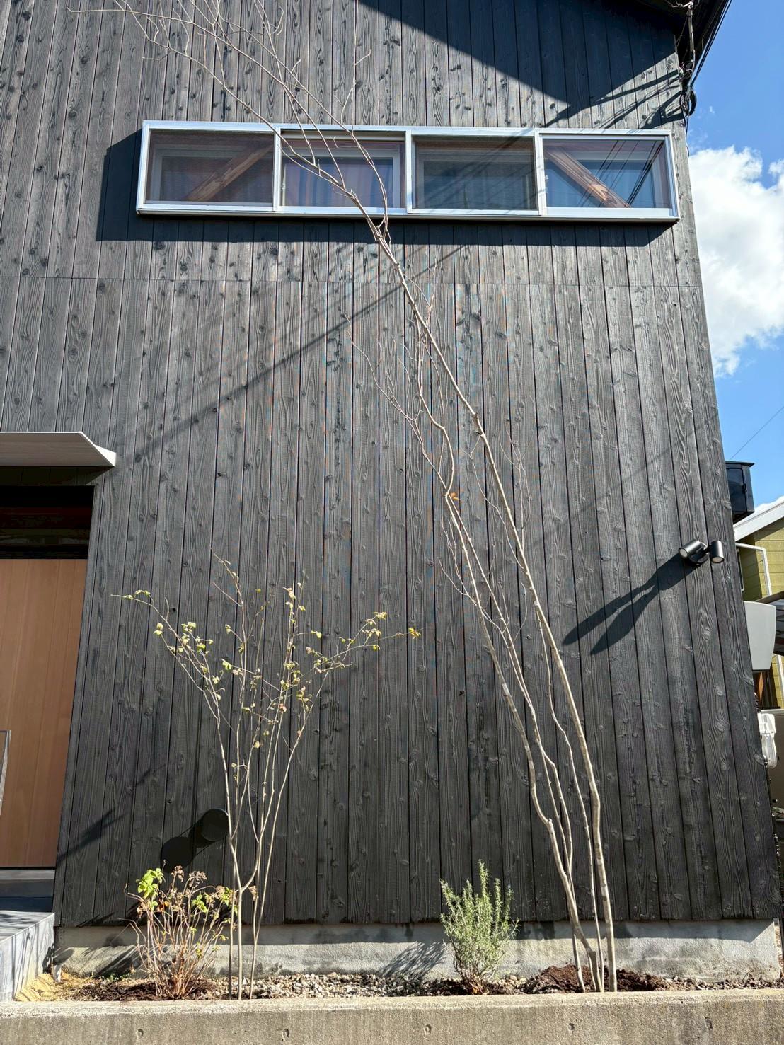玄関側の真っ黒の外壁には、アオダモ ・ツリバナ をメインに配置。
