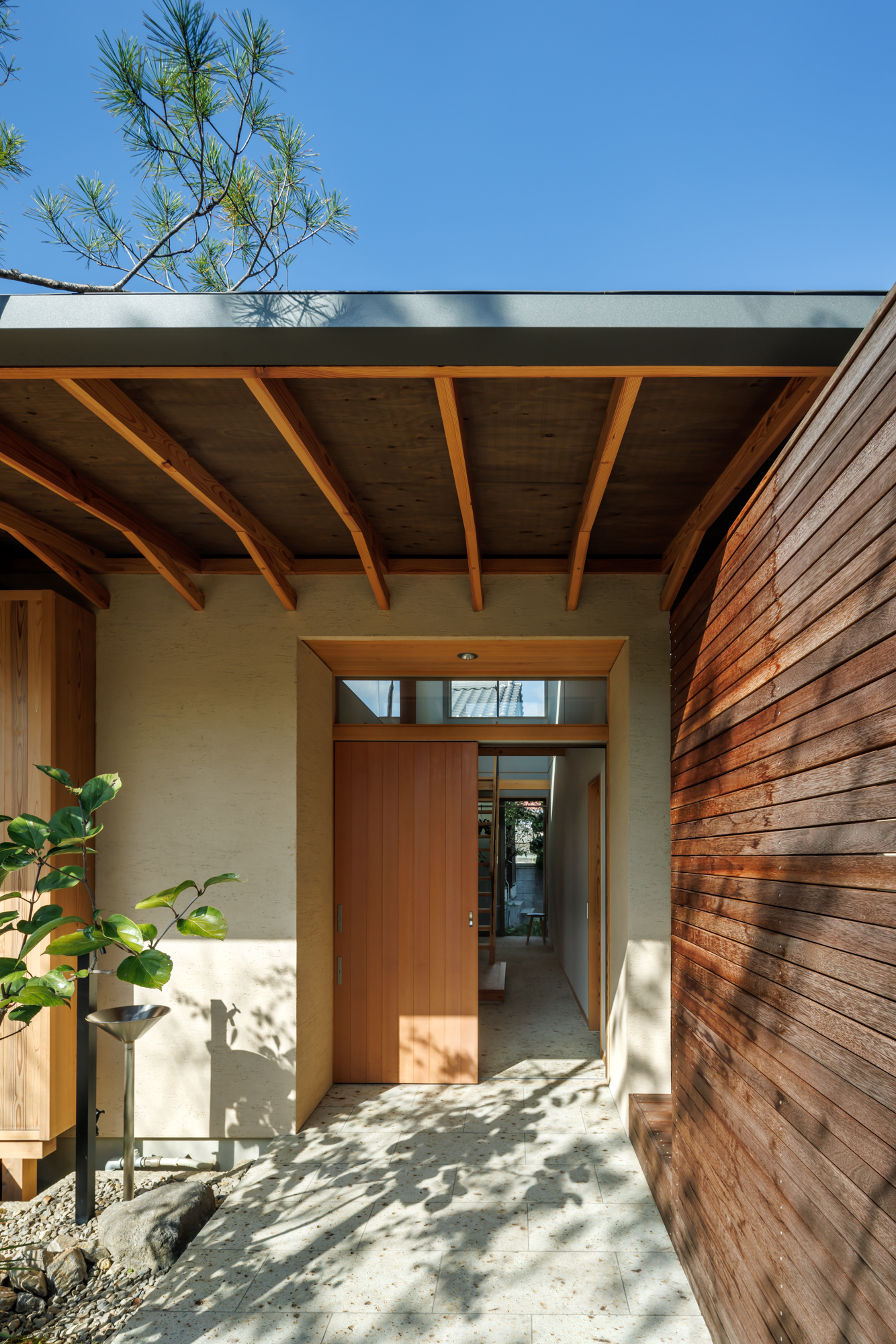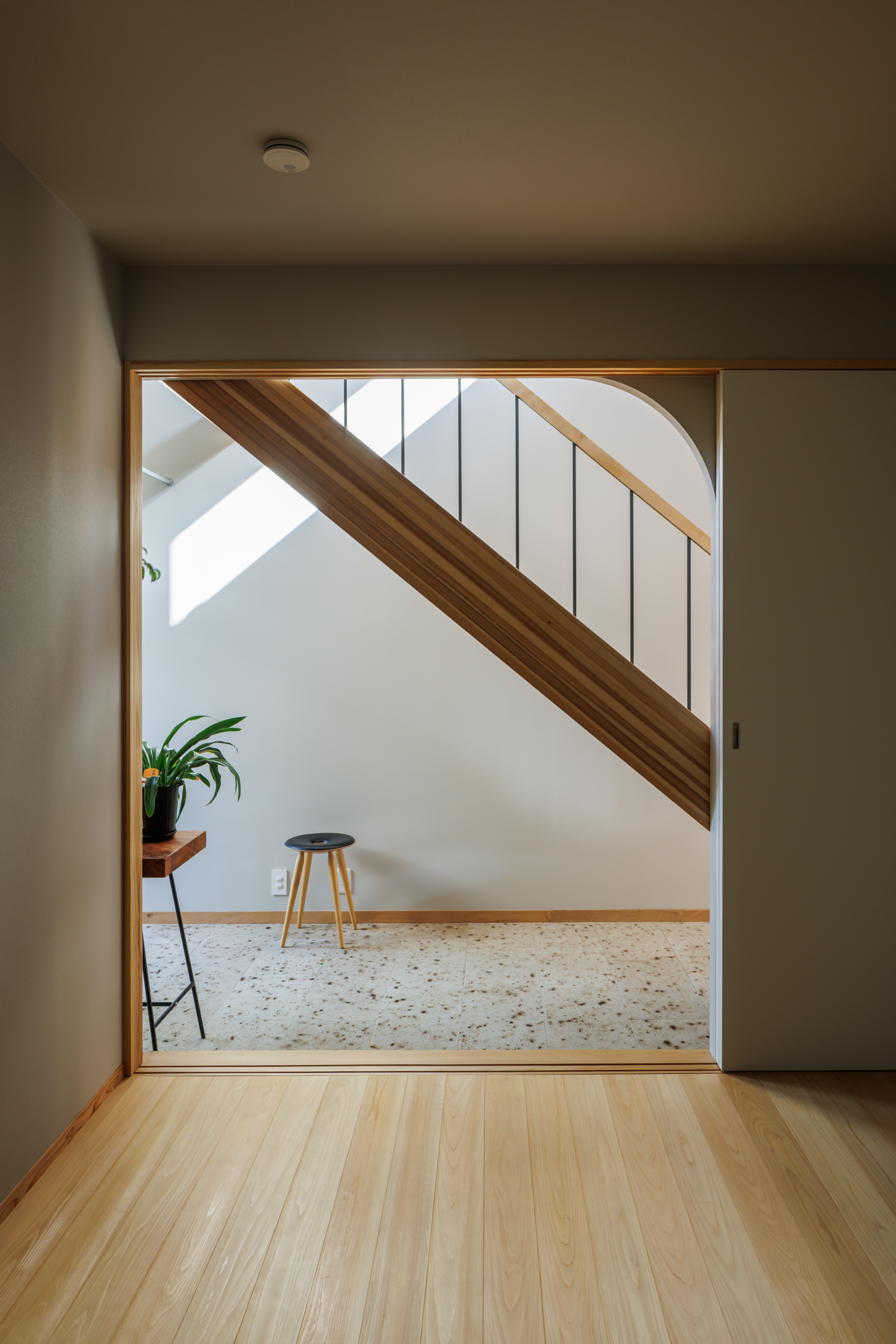 玄関には、都会とは思えないゆったりとした“長い土間”を設け、時間が緩やかに流れる空間を演出。